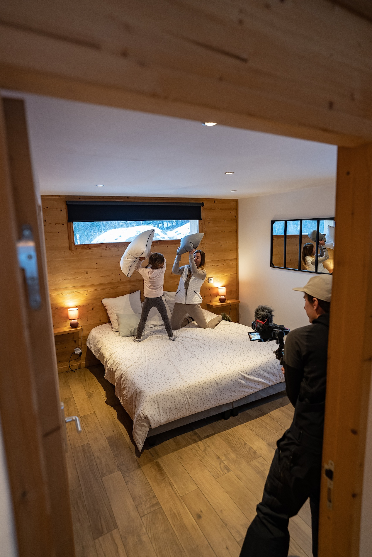 We imagined a scenario around an urban father who gets noticed at work for his… winter tan. At the request of his colleague, he then recounts his family vacation in Vars. His reserved character downplays his words, which contrast with the sensational activity footage.